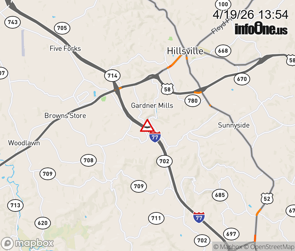 On Rt. 808 in the County of Carroll, in the vicinity of Bronco Rd; Rt. 703N/S (Carroll County), motorists can expect delays due to a tractor trailer crash. All north lanes are closed. All south lanes are closed. Updated: Sun 4/19/26 1:54 PM EDT ![]() Updated: Sun 4/19/26 1:54 PM EDT |