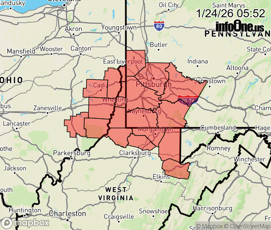 Canceled 1/24/26 6:50 AM Cold Weather Advisory issued January 24 at 5:50AM EST until January 24 at 7:00AM EST by NWS Pittsburgh PA * WHAT... Very cold wind chills between 10 below and 15 below zero expected. * WHERE... Portions of east central Ohio, southwest and western Pennsylvania, and northern and the northern panhandle of West Virginia. * WHEN... Until 7 AM EST this morning. * IMPACTS... The cold wind chills as low as 15 below zero could result in hypothermia if precautions are not taken. ![]() |