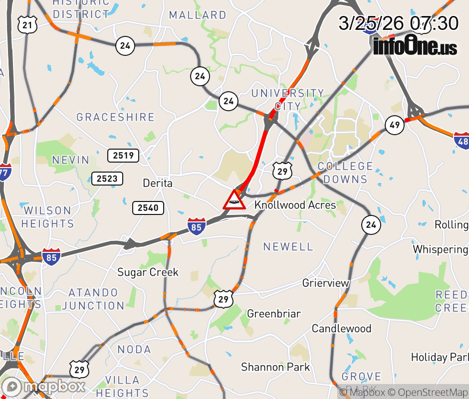 The right shoulder is closed at Exit 43 (University City Blvd.). Updated: Wed 3/25/26 7:30 AM EDT ![]() Updated: Wed 3/25/26 7:30 AM EDT |