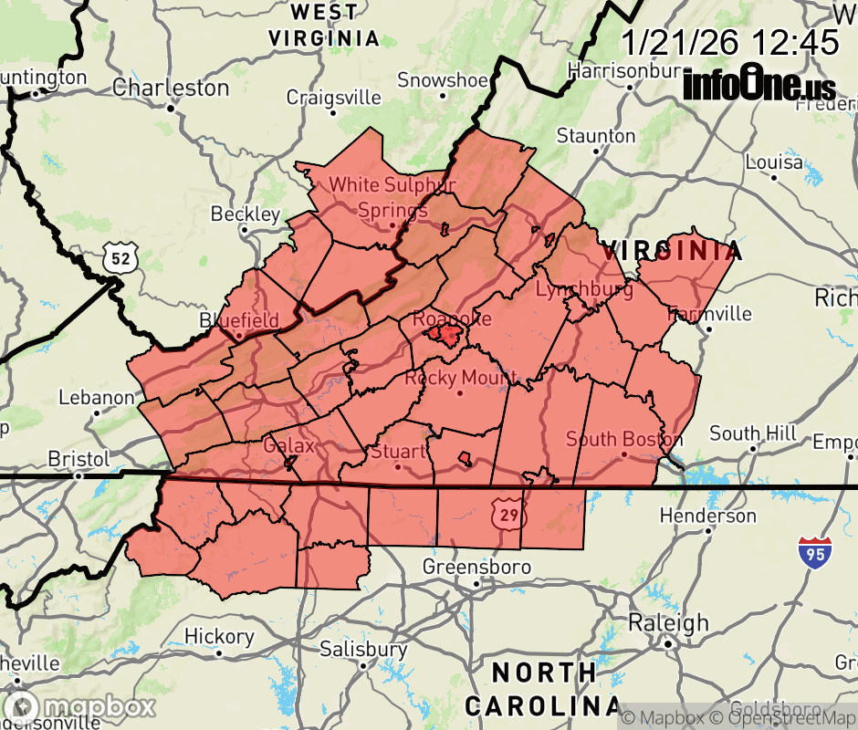 Winter Storm Watch issued January 21 at 12:44PM EST until January 26 at 1:00PM EST by NWS Blacksburg VA * WHAT... Heavy snow possible. Total snow and sleet accumulations between 8 and 14 inches possible. * WHERE... Portions of north central and northwest North Carolina, central, south central, southwest, and west central Virginia, and southeast West Virginia. * WHEN... From Saturday morning through Monday afternoon. * IMPACTS... Travel could be very difficult to impossible. The hazardous conditions could impact the Monday morning commute. ![]() |