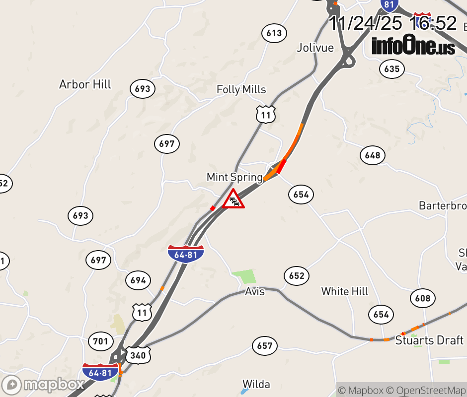 On I-81 at mile marker 217 in the County of Augusta, motorists can expect delays due to a brush fire. The north left shoulder and left lane are closed. Updated: Mon 11/24/25 4:52 PM EST ![]() Updated: Mon 11/24/25 4:52 PM EST |
