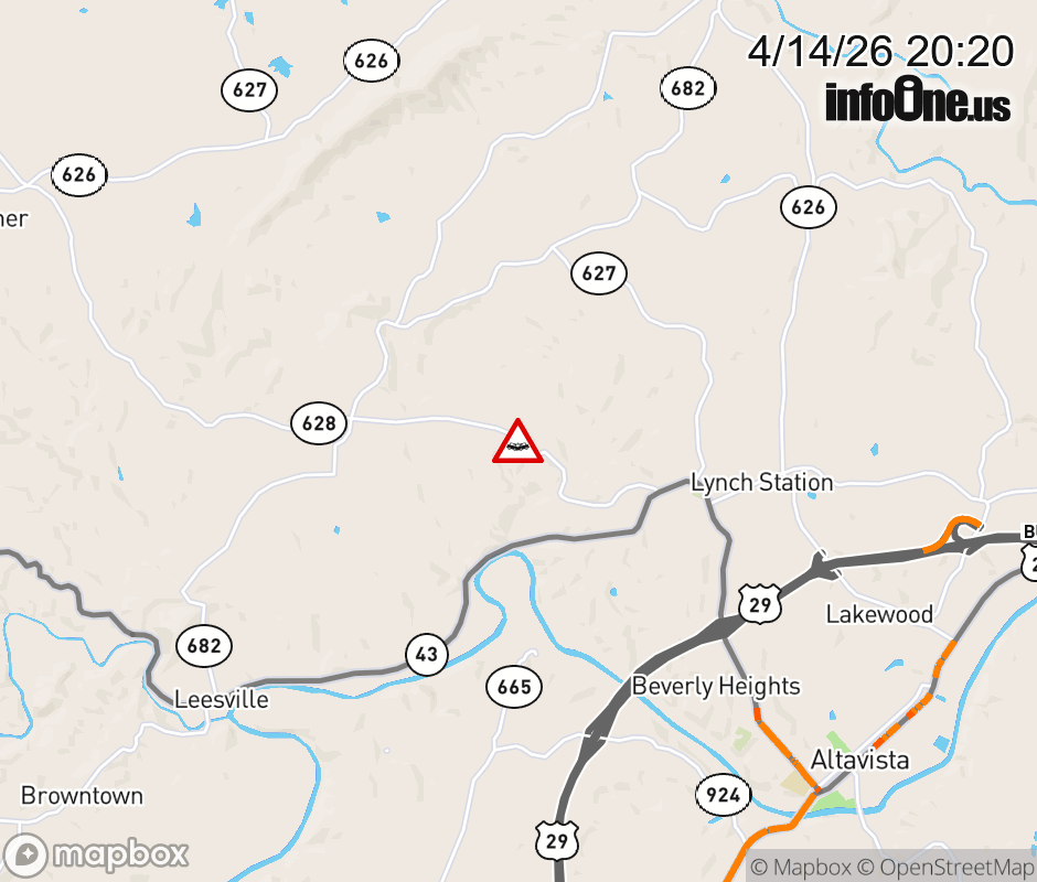 On Rt. 628 in the County of Campbell, in the vicinity of Bedford Hwy; VA-43N/S, motorists can expect delays due to a vehicle crash. All east lanes are closed. All west lanes are closed. Updated: Tue 4/14/26 8:20 PM EDT ![]() Updated: Tue 4/14/26 8:20 PM EDT |