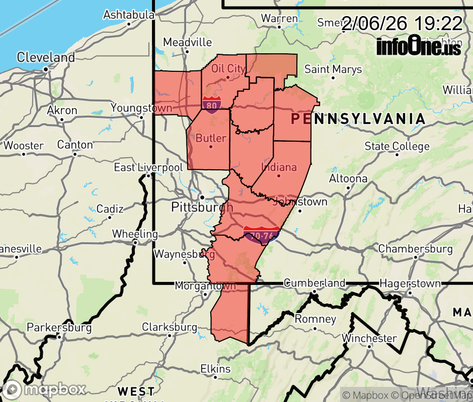 Canceled 2/7/26 5:54 AM Extreme Cold Warning issued February 6 at 7:21PM EST until February 8 at 10:00AM EST by NWS Pittsburgh PA * WHAT... Dangerously cold wind chills as low as 30 below zero expected. * WHERE... Portions of western Pennsylvania and northern West Virginia. * WHEN... From 1 AM Saturday to 10 AM EST Sunday. * IMPACTS... The dangerously cold wind chills as low as 30 below zero could cause frostbite on exposed skin in as little as 30 minutes. ![]() |
