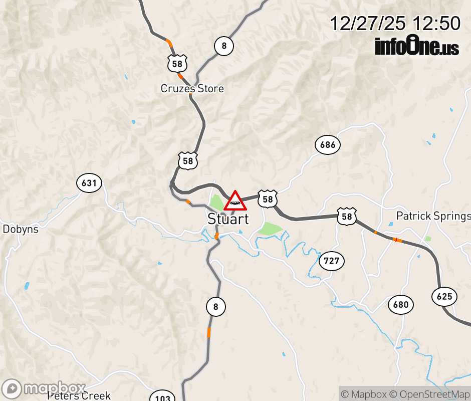 On US-58 in the County of Patrick, in the vicinity of Morrison Ln; Salem Ave; Rt. 830N/S (Patrick County), motorists can expect delays due to a vehicle crash. The west right lane and right shoulder are closed. ![]() |