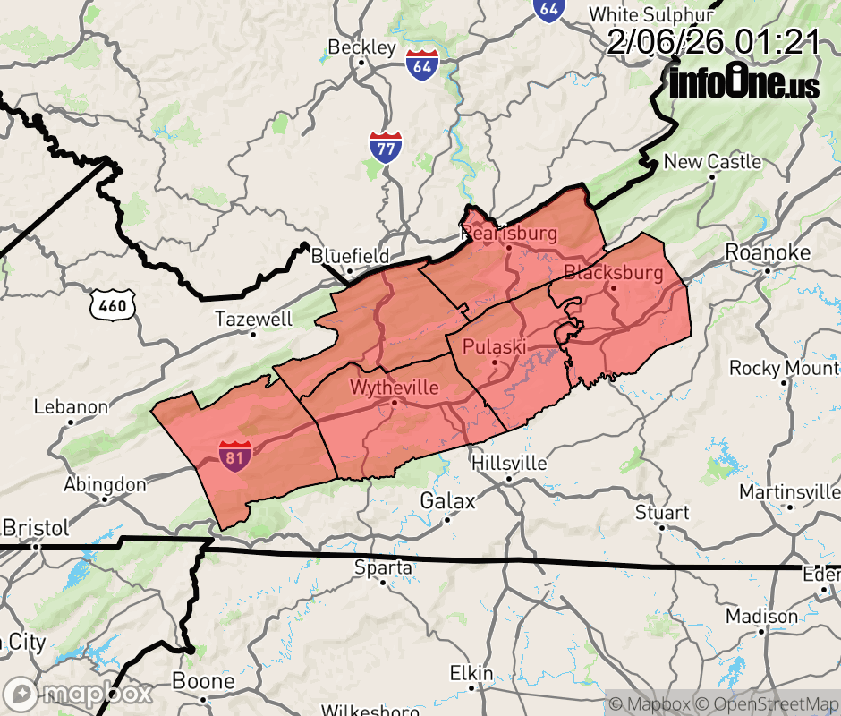 Wind Advisory issued February 6 at 1:20AM EST until February 7 at 7:00PM EST by NWS Blacksburg VA * WHAT... For the Wind Advisory, northwest winds 20 to 30 mph with gusts up to 50 mph expected. For the Cold Weather Advisory, very cold wind chills as low as 12 to 14 below expected. * WHERE... Bland, Giles, Montgomery, Pulaski, Smyth, and Wythe Counties. * WHEN... For the Wind Advisory, from 7 PM this evening to 7 PM EST Saturday. For the Cold Weather Advisory, from 1 AM Saturday to 7 AM EST Sunday. * IMPACTS... Gusty winds will blow around unsecured objects. Tree limbs could be blown down and a few power outages may result. The cold wind chills as low as 12 to 14 below zero could result in hypothermia if precautions are not taken. ![]() |
