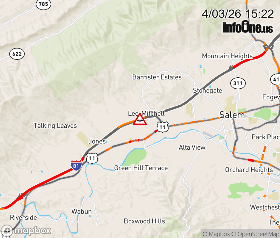 On I-81 at mile marker 136.7 in the County of Roanoke, motorists can expect delays due to a vehicle crash. The south left shoulder is closed. ![]() |