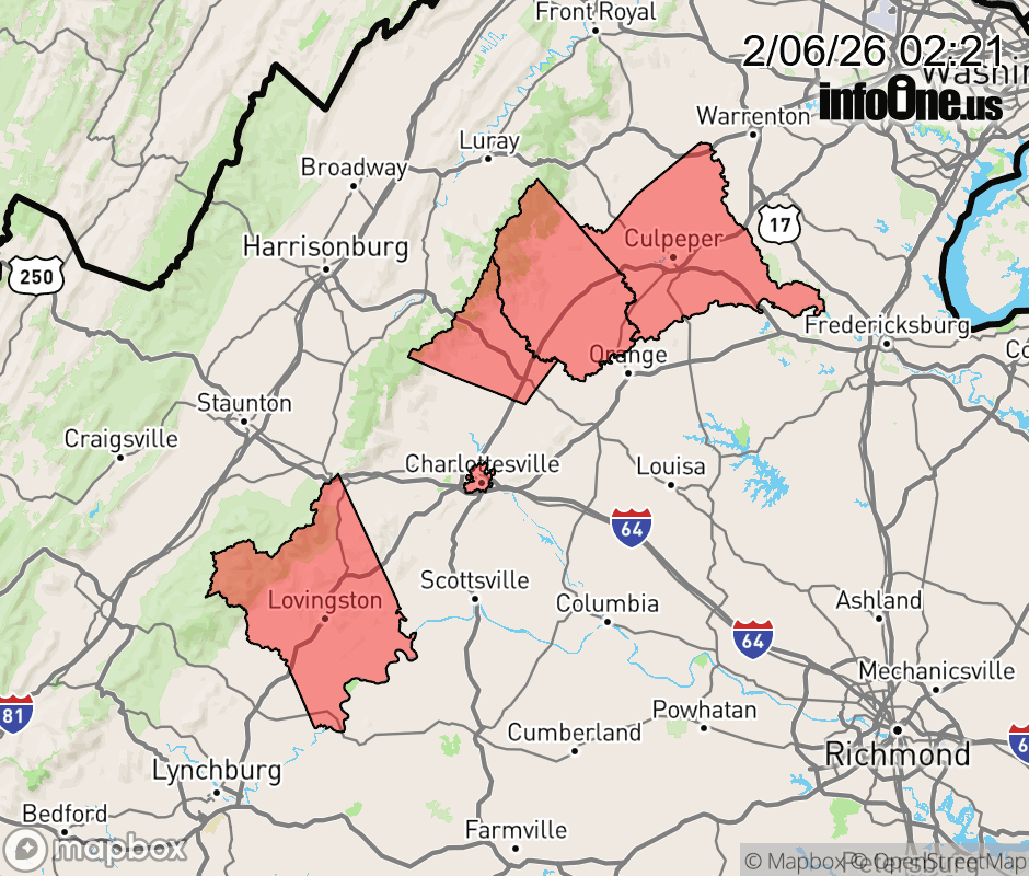 Canceled 2/6/26 9:31 AM Wind Advisory issued February 6 at 2:19AM EST until February 7 at 7:00PM EST by NWS Baltimore MD/Washington DC * WHAT... Northwest winds 15 to 25 mph with gusts up to 55 mph expected. * WHERE... Albemarle, Greene, Nelson, Culpeper, and Madison Counties. * WHEN... From 4 AM to 7 PM EST Saturday. * IMPACTS... Gusty winds will blow around unsecured objects. Tree limbs could be blown down and a few power outages may result. ![]() |