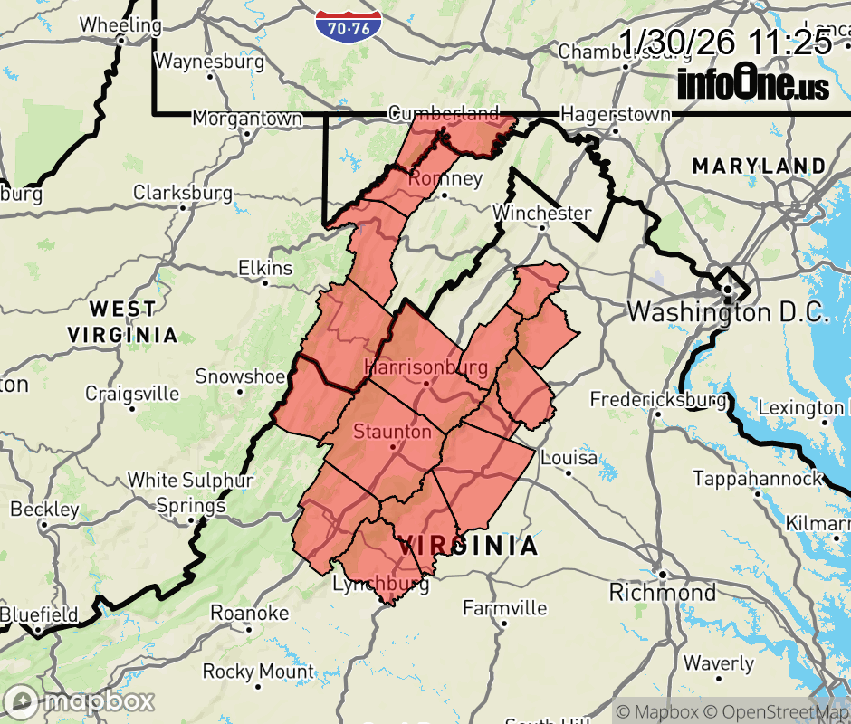 Canceled 1/30/26 7:31 PM Extreme Cold Watch issued January 30 at 11:23AM EST until February 1 at 1:00PM EST by NWS Baltimore MD/Washington DC * WHAT... For the Cold Weather Advisory, very cold wind chills as low as 15 below expected. For the Extreme Cold Watch, dangerously cold wind chills as low as 25 below possible. * WHERE... In Maryland, Eastern Garrett, Extreme Western Allegany, and Western Garrett Counties. In Virginia, Central Virginia Blue Ridge and Northern Virginia Blue Ridge, and Western Highland County. In West Virginia, Western Grant, Western Mineral, and Western Pendleton Counties. * WHEN... For the Cold Weather Advisory, from 7 PM this evening to 11 AM EST Saturday. For the Extreme Cold Watch, from Saturday evening through Sunday afternoon. * IMPACTS... Frostbite and hypothermia will occur if unprotected skin is exposed to these temperatures. Wind chill values can lead to hypothermia with prolonged exposure. ![]() |