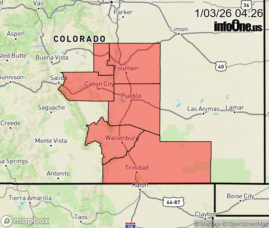 Canceled 1/3/26 3:39 PM Fire Weather Watch issued January 3 at 2:25AM MST until January 4 at 5:00PM MST by NWS Pueblo CO * AFFECTED AREA... Fire Weather Zones 221, 222, 226, 227, 228, 229 and 230. * WINDS... Southwest 15 to 25 mph with gusts up to 45 mph. * RELATIVE HUMIDITY... 10 to 15 percent. * IMPACTS... Elevated fire danger is expected. Fires will catch and spread rapidly and erratically. ![]() |