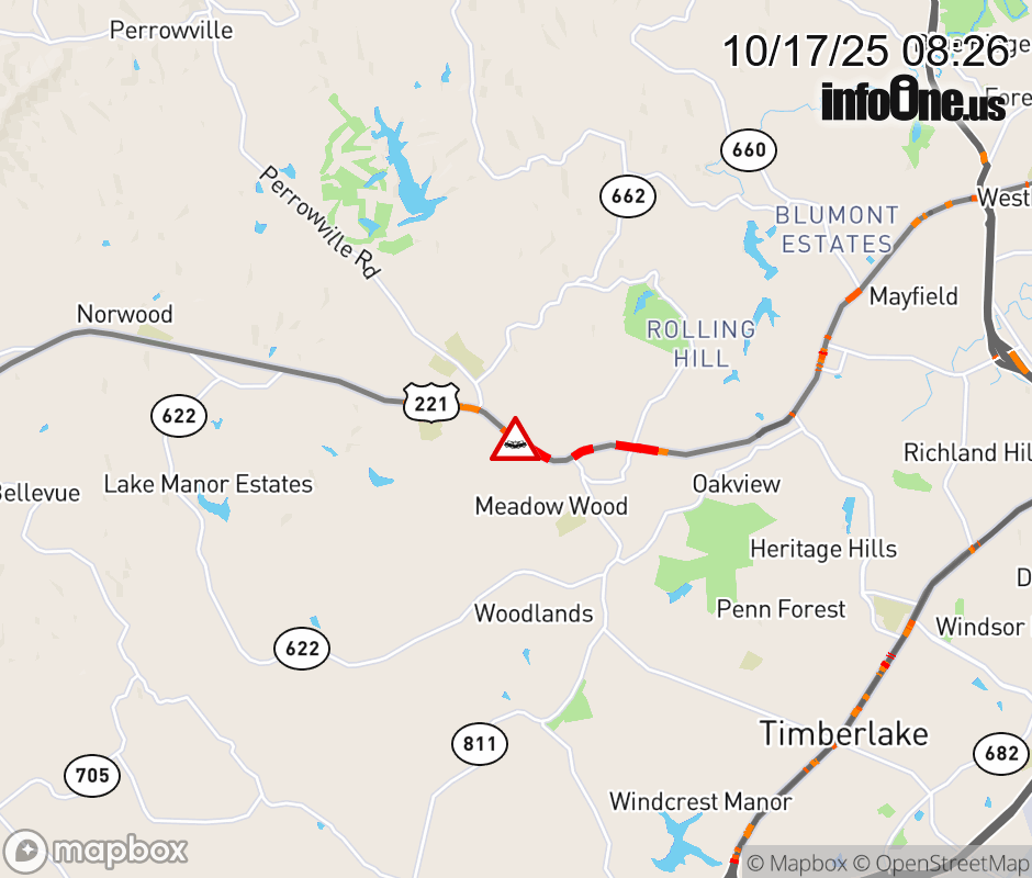 On US-221 North in the County of Bedford, in the vicinity of Elkton Farm Rd; Rt. 666E/W (Bedford County), motorists can expect delays due to a vehicle crash. Lane closures exist. ![]() |