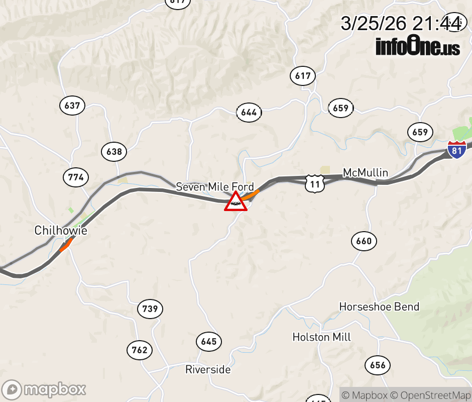 On I-81 at mile marker 39 in the County of Smyth, motorists can expect delays due to a vehicle crash. The south left shoulder and left lane are closed. Updated: Wed 3/25/26 9:44 PM EDT ![]() Updated: Wed 3/25/26 9:44 PM EDT |