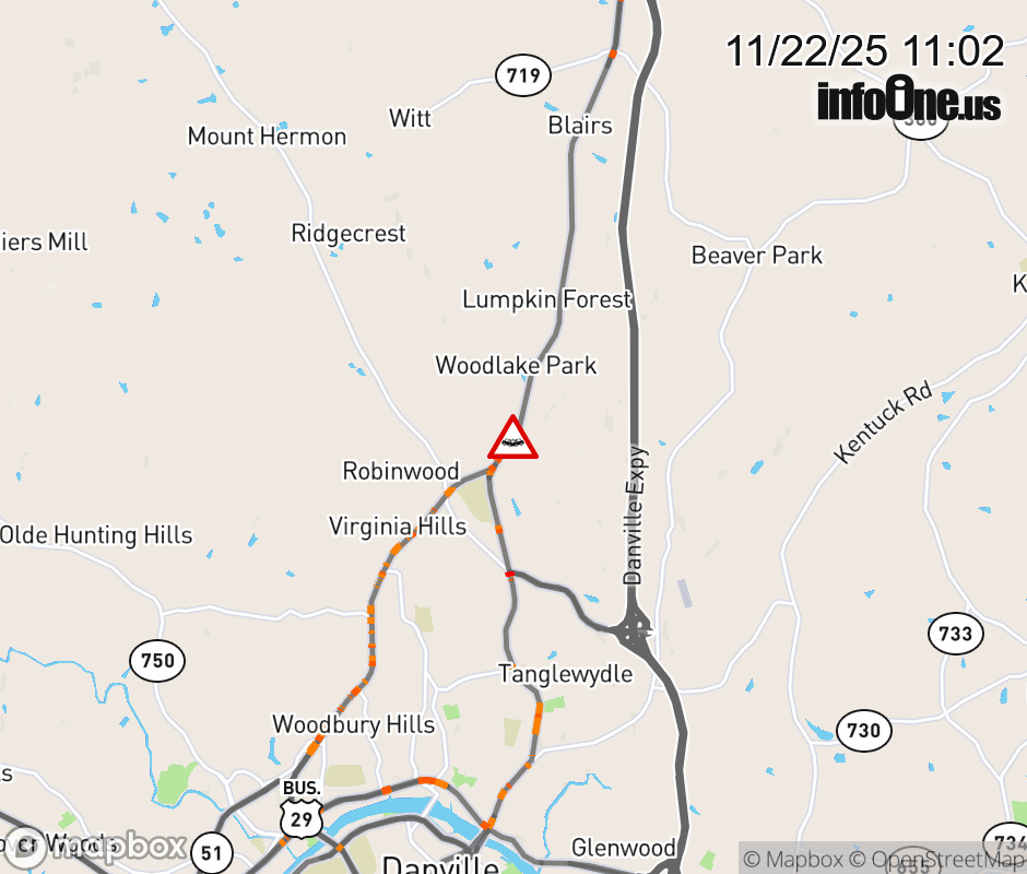 On BUS US-29 North in the County of Pittsylvania, in the vicinity of Greenwood Dr; Rt. 1505N/S (Pittsylvania County), motorists can expect delays due to a vehicle crash. Lane closures exist. ![]() |