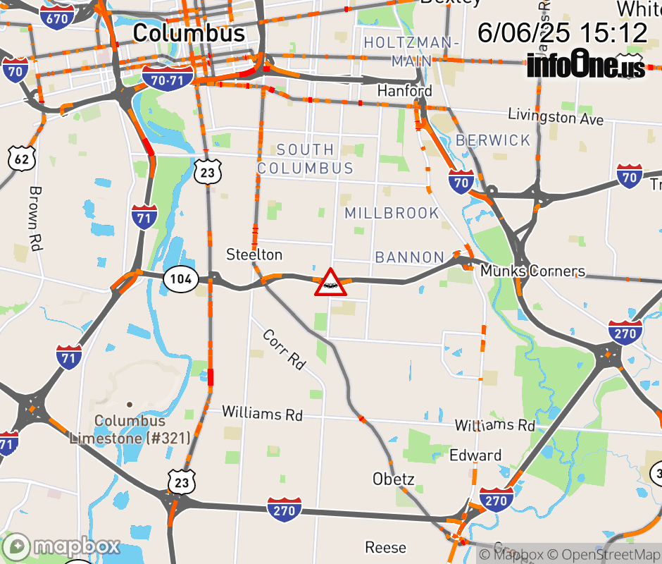 The right lane is blocked on SR-104 West at Lockbourne Rd, due to a crash. Updated: Fri 6/6/25 3:12 PM EDT ![]() |