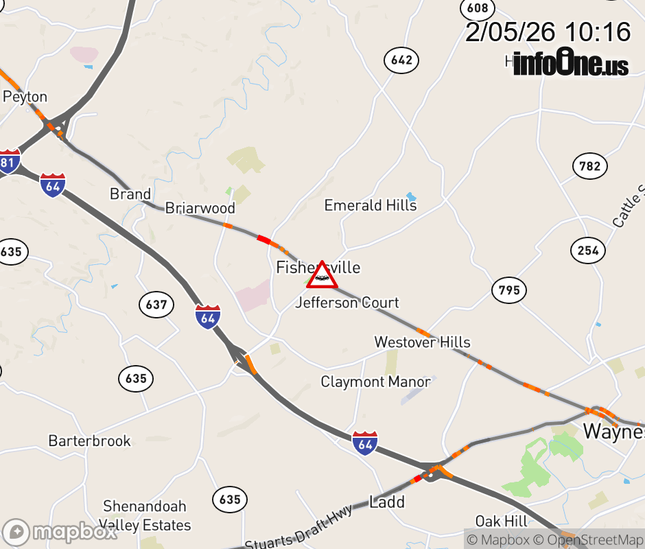 On Rt. 608 in the County of Augusta, in the vicinity of Fishersville Rd; Rt. 641E/W (Augusta County), motorists can expect delays due to a vehicle crash. All north lanes are closed. All south lanes are closed. Updated: Thu 2/5/26 10:16 AM EST ![]() Updated: Thu 2/5/26 10:16 AM EST |