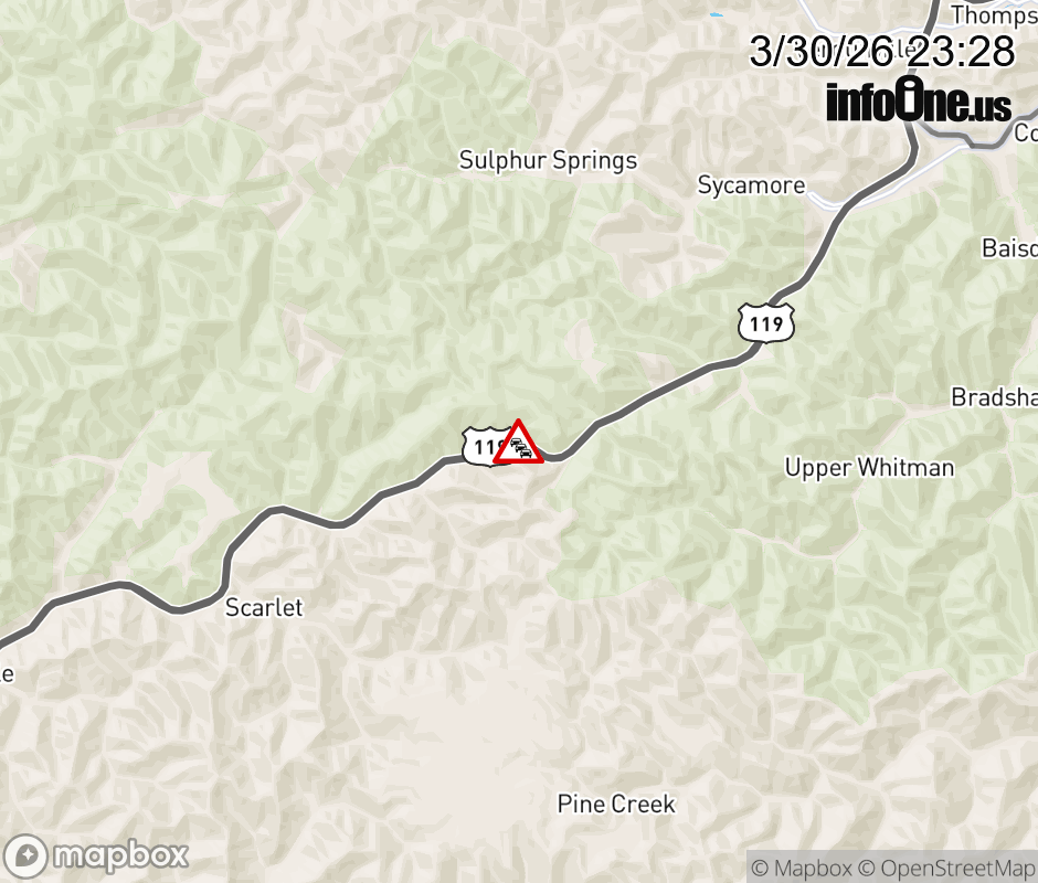 Vehicle Fire on US-119 & CR-65/30 (22 Mine Road). The southbound left lane is closed. Updated: Mon 3/30/26 11:28 PM EDT ![]() Updated: Mon 3/30/26 11:28 PM EDT |
