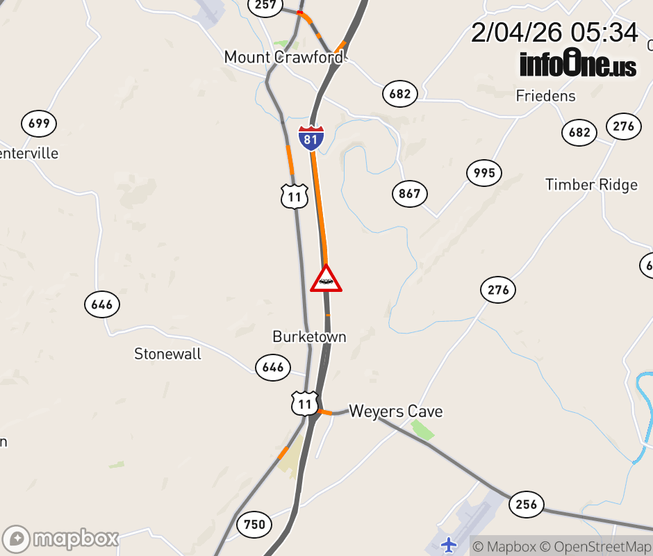On I-81 at mile marker 237 in the County of Rockingham, motorists can expect delays due to a vehicle crash. The north right shoulder is closed. Updated: Wed 2/4/26 5:34 AM EST ![]() Updated: Wed 2/4/26 5:34 AM EST |