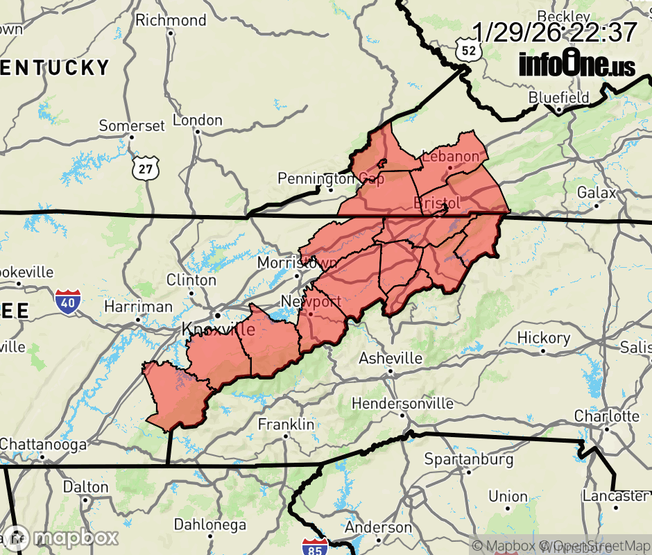 Canceled 1/30/26 12:02 AM Winter Storm Warning issued January 29 at 10:36PM EST until February 1 at 1:00AM EST by NWS Morristown TN * WHAT... Heavy snow expected. Total snow accumulations between 3 and 7 inches possible, with locally higher amounts up to 10 inches over the higher peaks of the east Tennessee mountains. Winds gusting as high as 35 mph. * WHERE... Portions of east Tennessee and southwest Virginia. * WHEN... From 1 PM Friday to 1 AM EST Sunday. * IMPACTS... Travel could be very difficult. The hazardous conditions could impact the Friday evening commute. ![]() |