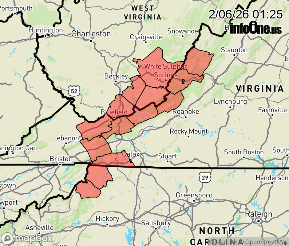 Canceled 2/6/26 12:58 PM Winter Weather Advisory issued February 6 at 1:24AM EST until February 7 at 7:00AM EST by NWS Blacksburg VA * WHAT... Snow expected. Total snow accumulations between 1 and 6 inches. Winds gusting as high as 60 mph. * WHERE... Portions of northwest North Carolina, southwest and west central Virginia, and southeast West Virginia. * WHEN... From 1 PM this afternoon to 7 AM EST Saturday. * IMPACTS... Roads, and especially bridges and overpasses, will likely become slick and hazardous. Plan on slippery road conditions. The hazardous conditions could impact the Friday evening commute. Strong winds could cause tree damage. ![]() |