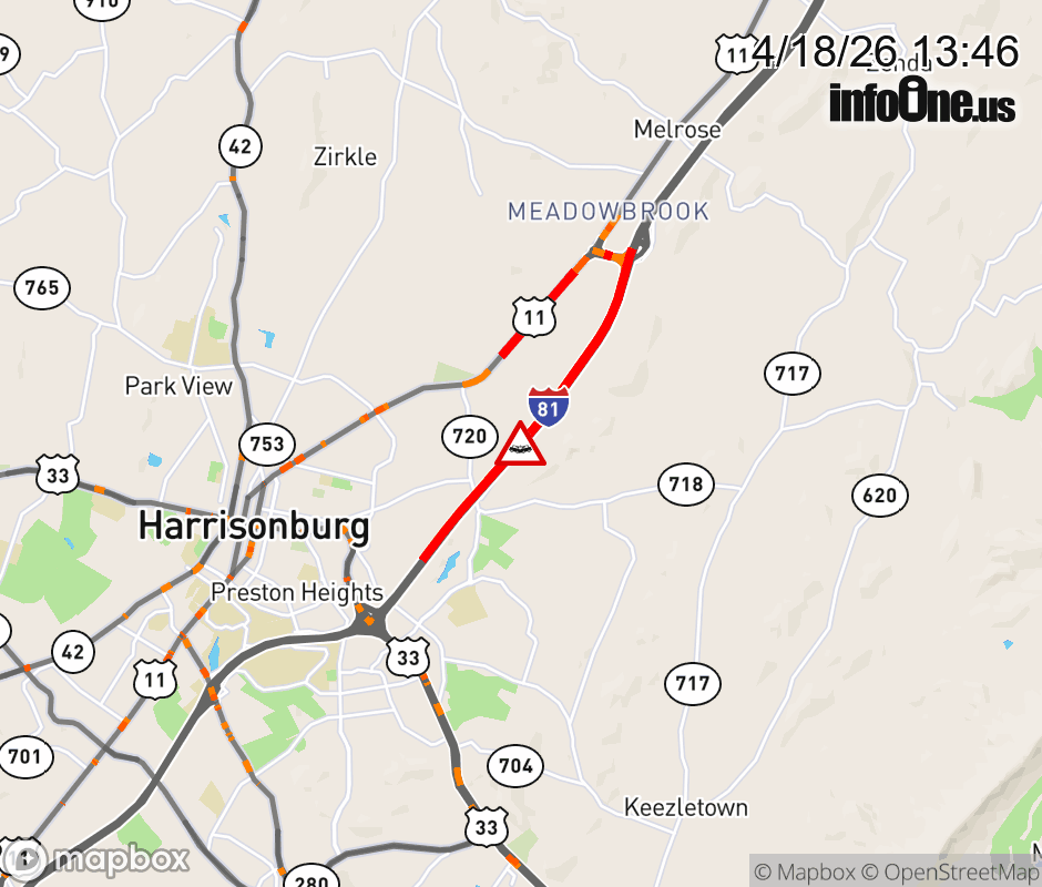 On I-81 South at mile marker 249.4 in the County of Rockingham, motorists can expect delays due to a vehicle crash. Traffic backups are approximately 2.0 miles. Updated: Sat 4/18/26 1:46 PM EDT ![]() Updated: Sat 4/18/26 1:46 PM EDT |
