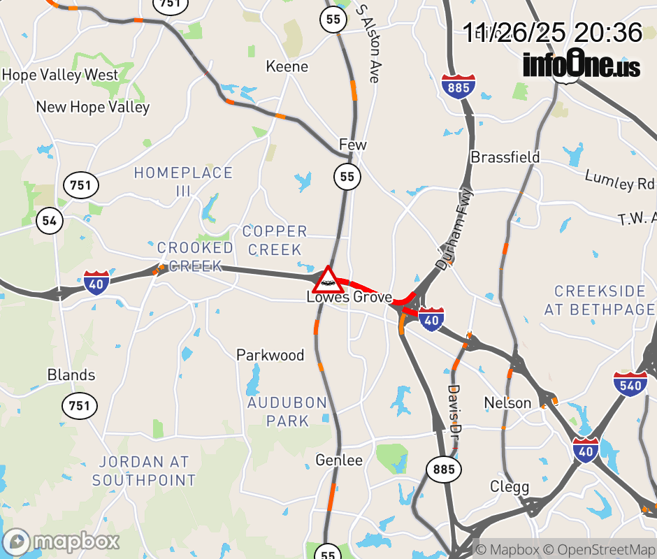 The left two lanes are closed before Exit 278 (NC 55). Updated: Wed 11/26/25 8:36 PM EST ![]() Updated: Wed 11/26/25 8:36 PM EST |