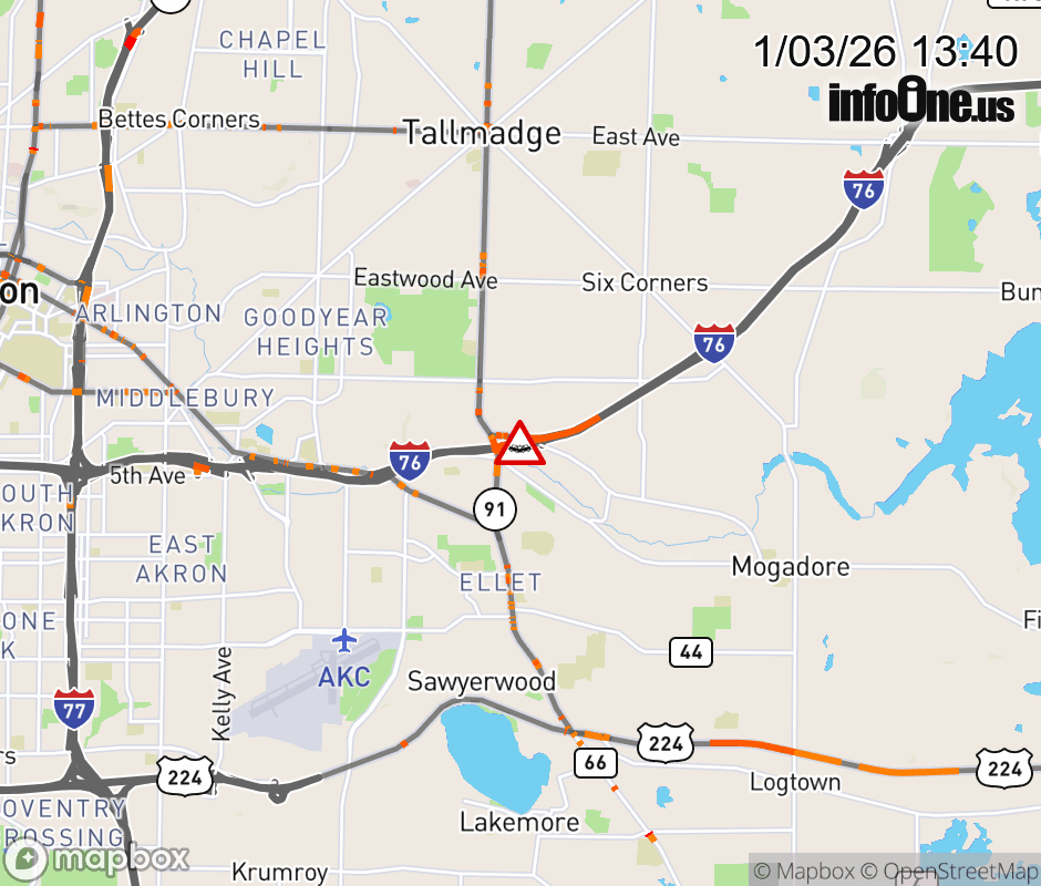 The right lane is blocked on I-76 West at SR-91/Gilchrist Rd/Canton Rd, due to a crash. ![]() |