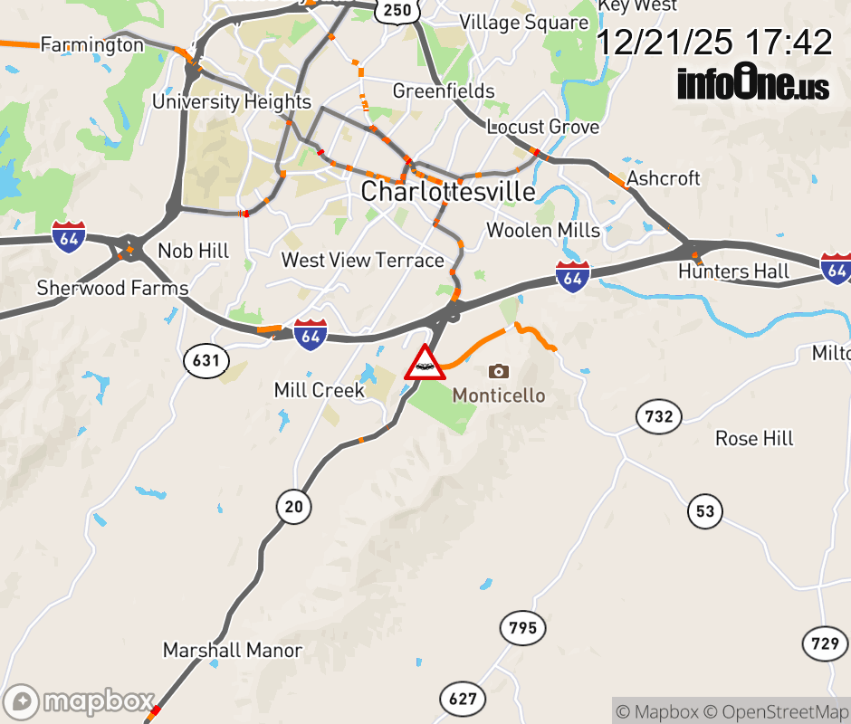 On VA-53 East in the County of Albemarle, in the vicinity of Scottsville Rd; VA-20N, motorists can expect delays due to a vehicle crash. Updated: Sun 12/21/25 5:42 PM EST ![]() Updated: Sun 12/21/25 5:42 PM EST |