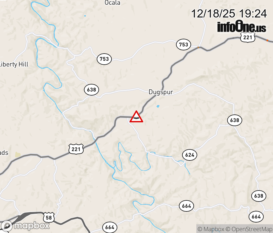 On US-221 North in the County of Carroll, in the vicinity of Poplar Hill Dr; Rt. 662N/S (Carroll County), motorists can expect delays due to a vehicle crash. Lane closures exist.