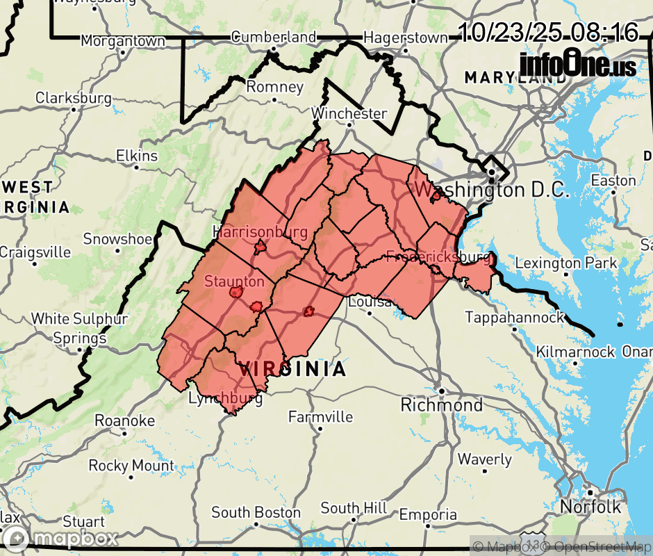 Canceled 10/23/25 7:00 PM Special Weather Statement issued October 23 at 8:10AM EDT by NWS Baltimore MD/Washington DC The combination of recent dry conditions, relative humidity falling to 15 to 30 percent, and sustained west winds 10 to 15 mph with gusts of 20 to 30 mph will likely result in an elevated threat for the rapid spread of fires today, particularly from late morning through late afternoon. Please refer to your local burn permitting authorities on whether you may burn outdoors. If you do burn, use extreme caution since fires can quickly grow out of control under these conditions. ![]() |