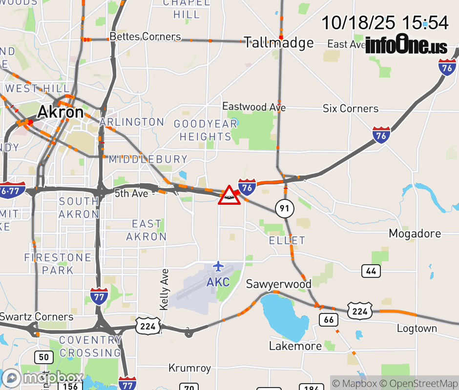 The left lane is blocked on I-76 West beyond SR-18/E Market St, due to a crash. Updated: Sat 10/18/25 3:54 PM EDT ![]() Updated: Sat 10/18/25 3:54 PM EDT |