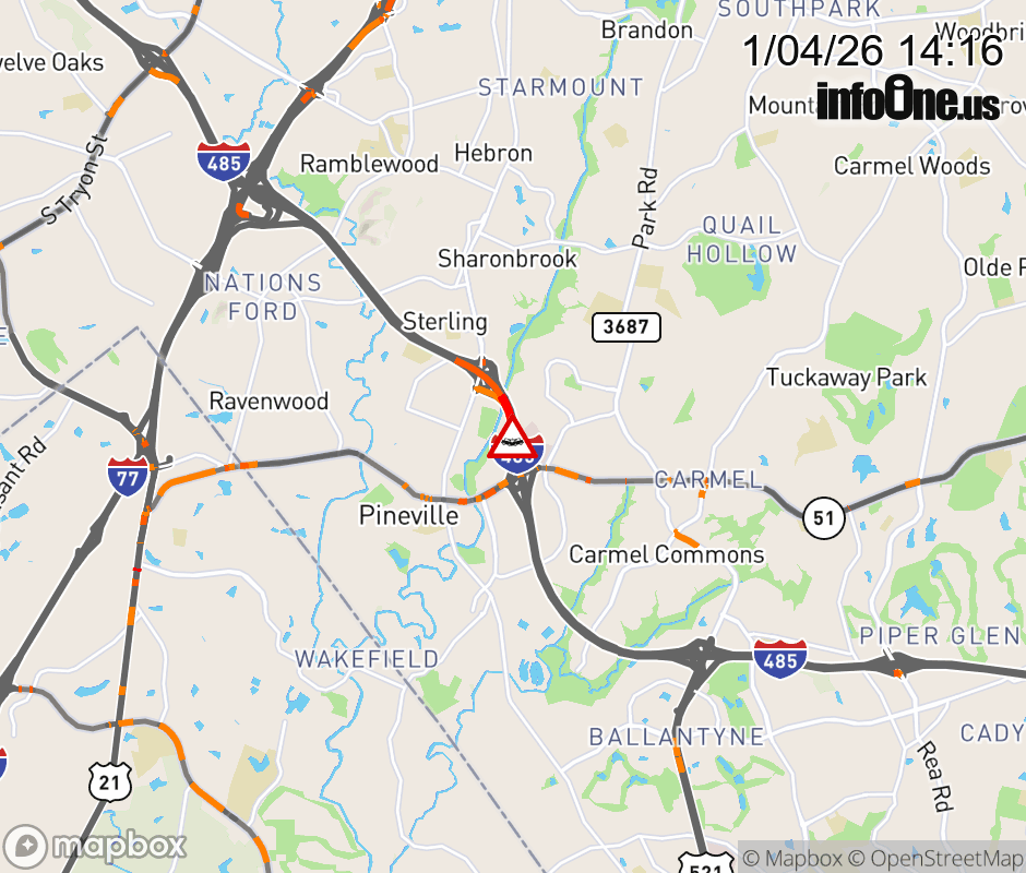 The right lane is closed at Exit 64 B (NC 51/Pineville Mathews Rd). Updated: Sun 1/4/26 2:16 PM EST ![]() Updated: Sun 1/4/26 2:16 PM EST |