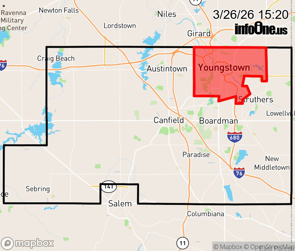 Canceled 3/26/26 5:10 PM Mahoning County has 1 power outage affecting 1 customer. Ohio Edison 1 without power Youngstown: Customers affected: 19 (< 1%) Estimated repair: Thu 6:00 PM Updated: Thu 3/26/26 4:50 PM EDT ![]() Updated: Thu 3/26/26 3:20 PM EDT |