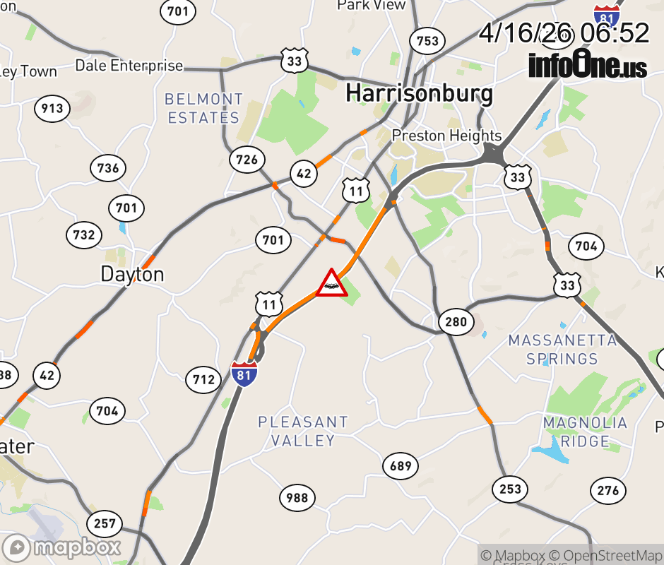 On I-81 at mile marker 244.6 in the County of Rockingham, motorists can expect delays due to a vehicle crash. The south left shoulder and left lane are closed. Updated: Thu 4/16/26 6:52 AM EDT ![]() Updated: Thu 4/16/26 6:52 AM EDT |
