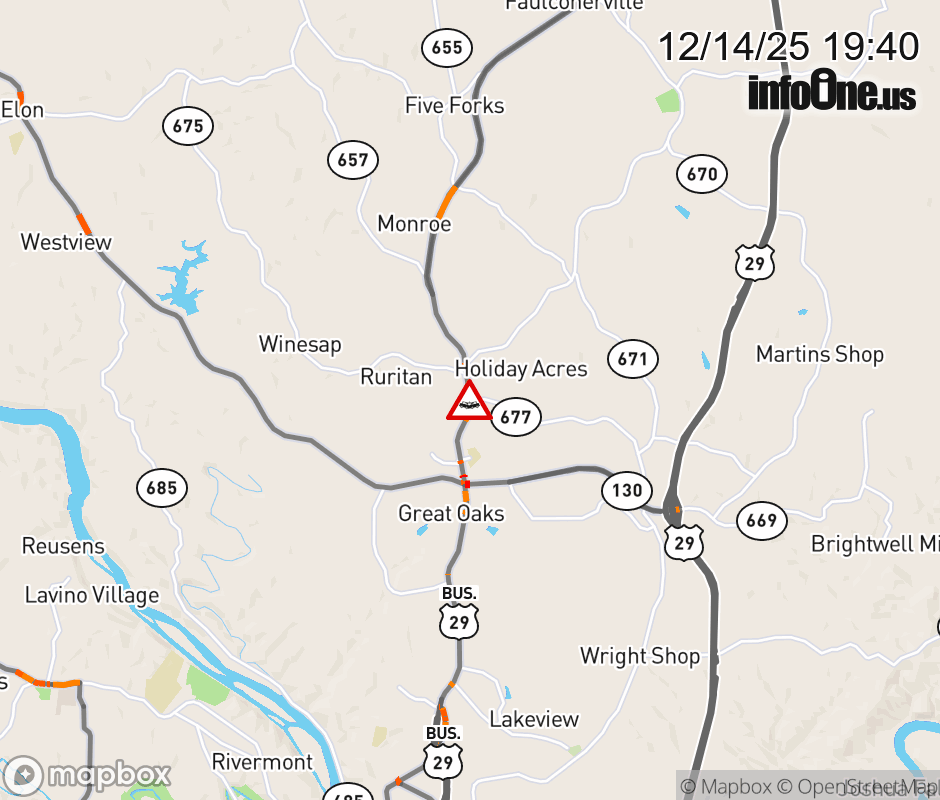 On BUS US-29 in the County of Amherst, in the vicinity of Dixie Airport Rd; Rt. 677N/S (Amherst County), motorists can expect delays due to a vehicle crash. All south lanes are closed. Updated: Sun 12/14/25 7:40 PM EST ![]() Updated: Sun 12/14/25 7:40 PM EST |