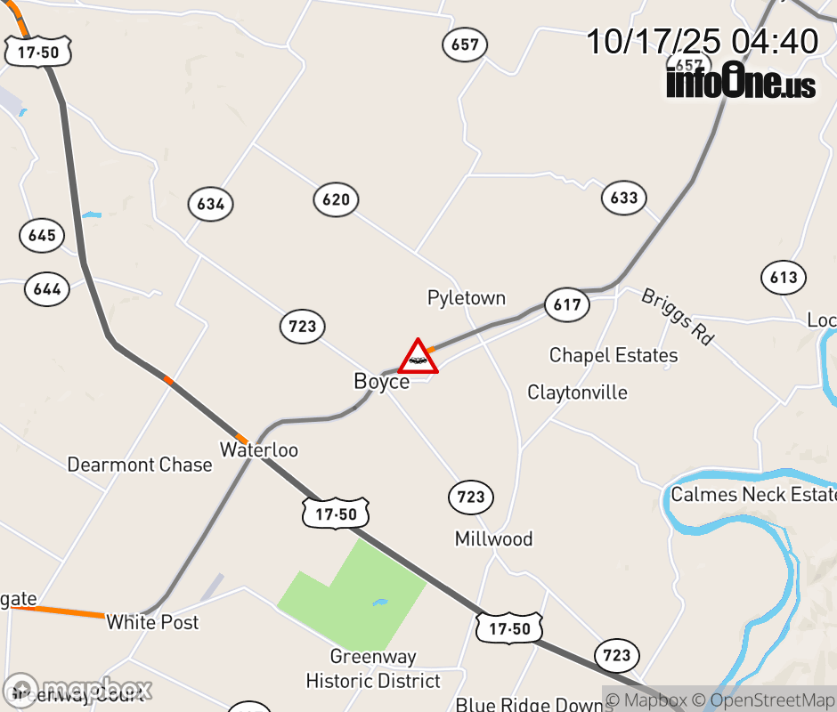 On US-340 in the County of Clarke, in the vicinity of County/City/Town Line: BOYCE, motorists can expect delays due to a tractor trailer crash. All north lanes are closed. ![]() |