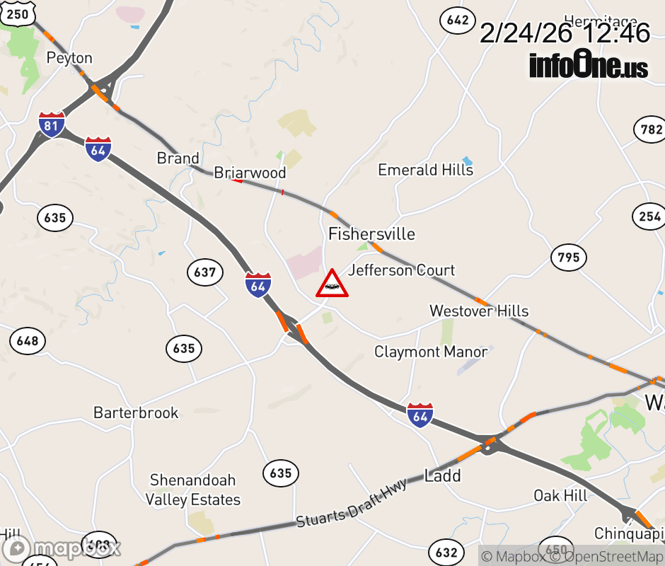 On VA-285 in the County of Augusta, in the vicinity of Mule Academy Rd; Rt. 642N/S (Augusta County), motorists can expect delays due to a vehicle crash. All north lanes are closed. ![]() |