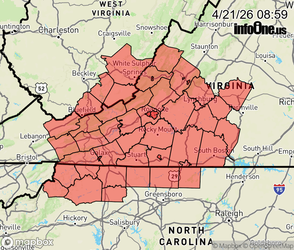 Canceled 4/21/26 9:00 AM Freeze Warning issued April 21 at 8:57AM EDT until April 21 at 9:00AM EDT by NWS Blacksburg VA The threat has ended. ![]() |