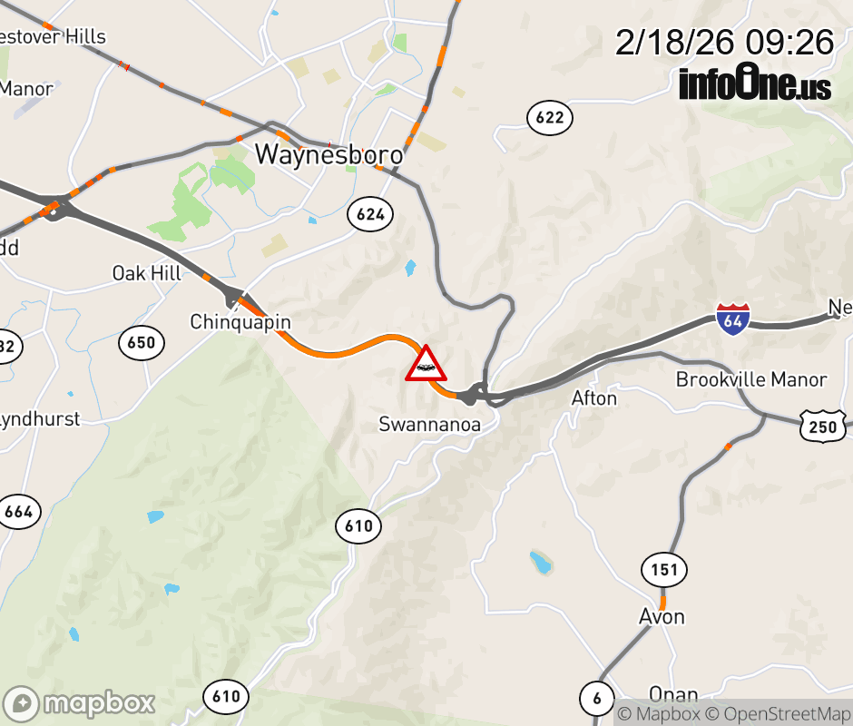 On I-64 at mile marker 99 in the County of Augusta, motorists can expect delays due to a vehicle crash. The west exit ramp narrows. ![]() |