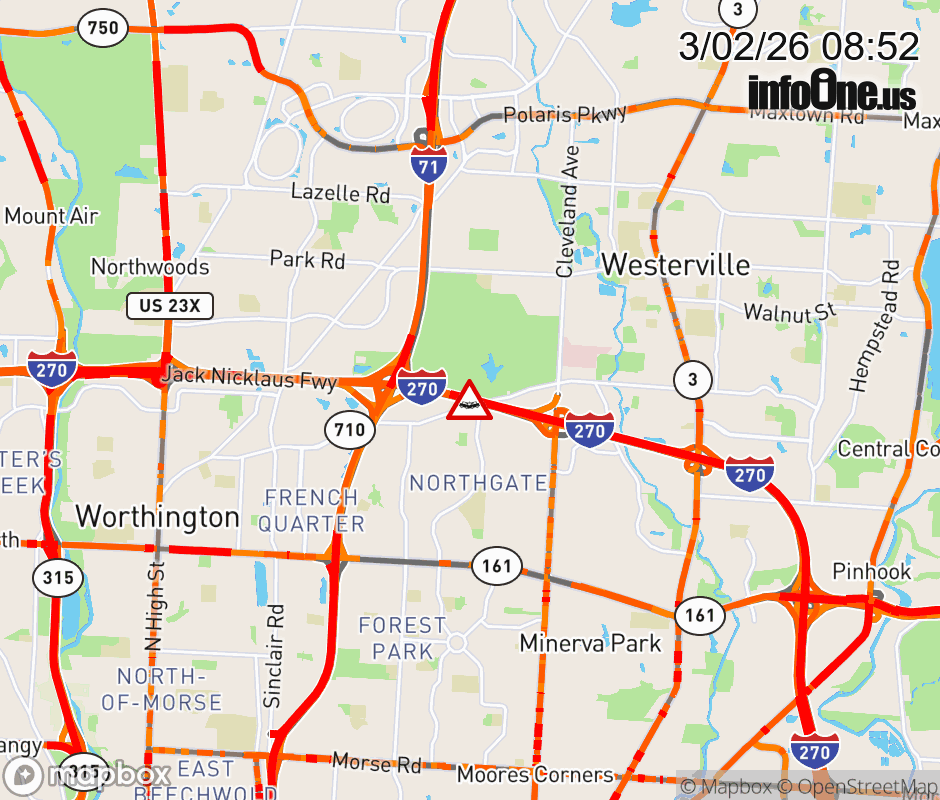 The left lane is blocked on I-270 West at I-71, due to a crash. Updated: Mon 3/2/26 8:52 AM EST ![]() Updated: Mon 3/2/26 8:52 AM EST |