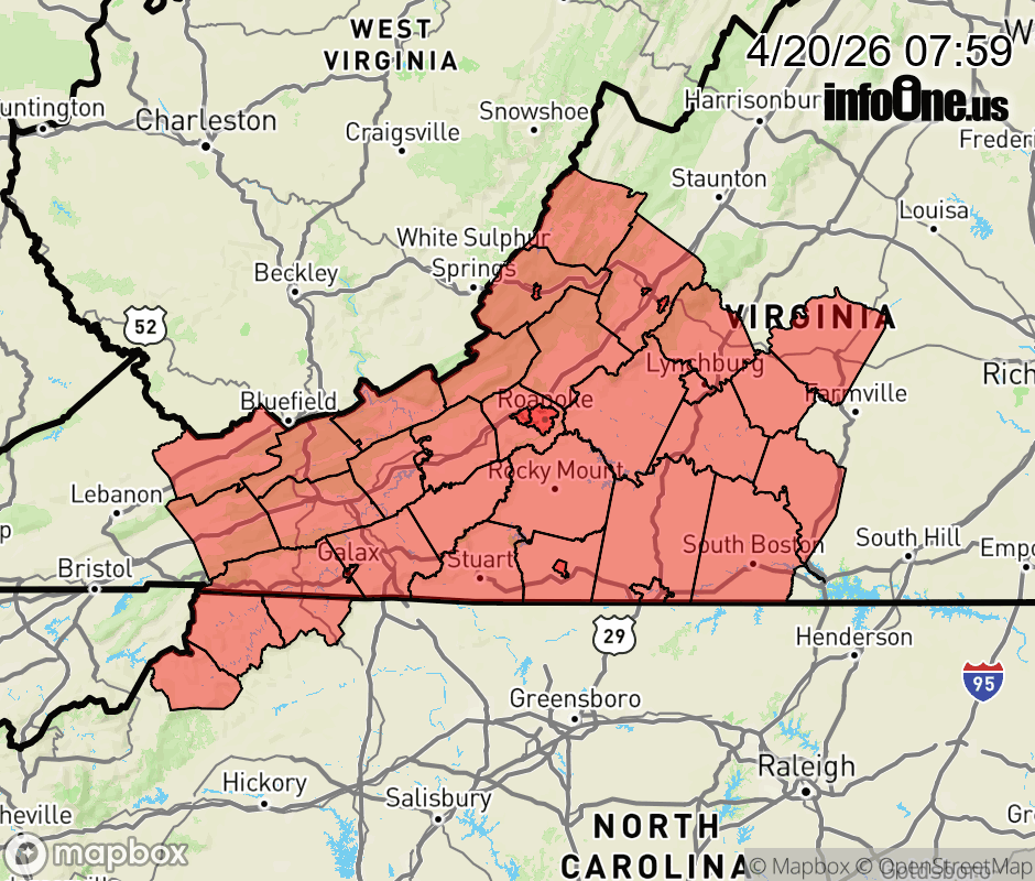 Freeze Warning issued April 20 at 7:58AM EDT until April 21 at 9:00AM EDT by NWS Blacksburg VA * WHAT... Sub-freezing temperatures as low as 31 expected. * WHERE... Portions of northwest North Carolina and central, south central, southwest, and west central Virginia. * WHEN... From midnight tonight to 9 AM EDT Tuesday. * IMPACTS... Frost and freeze conditions could kill crops, other sensitive vegetation and possibly damage unprotected outdoor plumbing. ![]() |