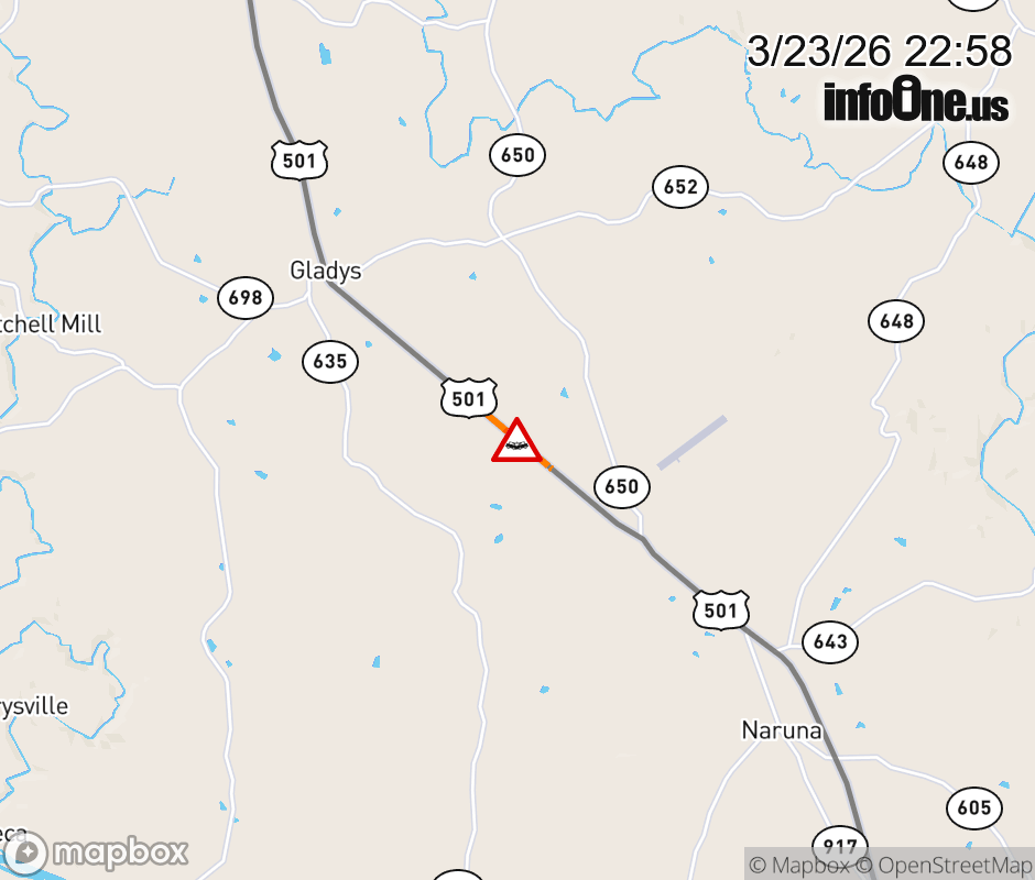 On US-501 North in the County of Campbell, in the vicinity of Hunters Ln; Long Island Rd; Pigeon Run Rd; Rt. 970E/W (Campbell County), motorists can expect delays due to a vehicle crash. Lane closures exist. ![]() |