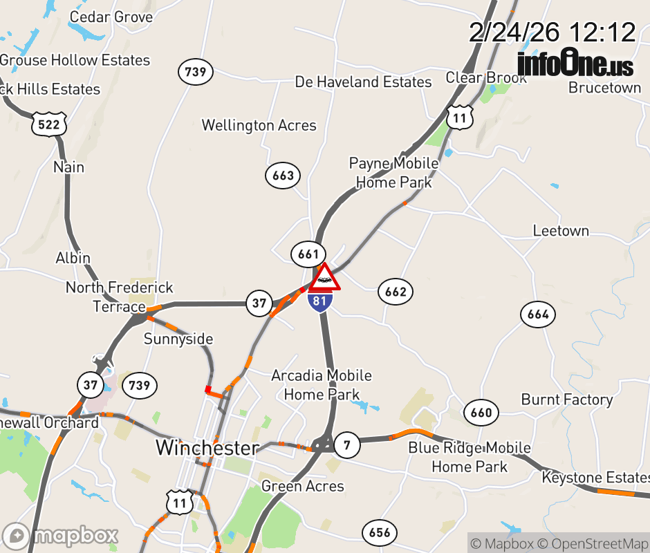On US-11 in the County of Frederick, in the vicinity of I81, Access; Martinsburg Enter Ramp N; US-11U Ramp 332B; Rt. 661N (Frederick County), US-11U Ramp 332B, motorists can expect delays due to a vehicle crash. The south right shoulder is closed. ![]() |