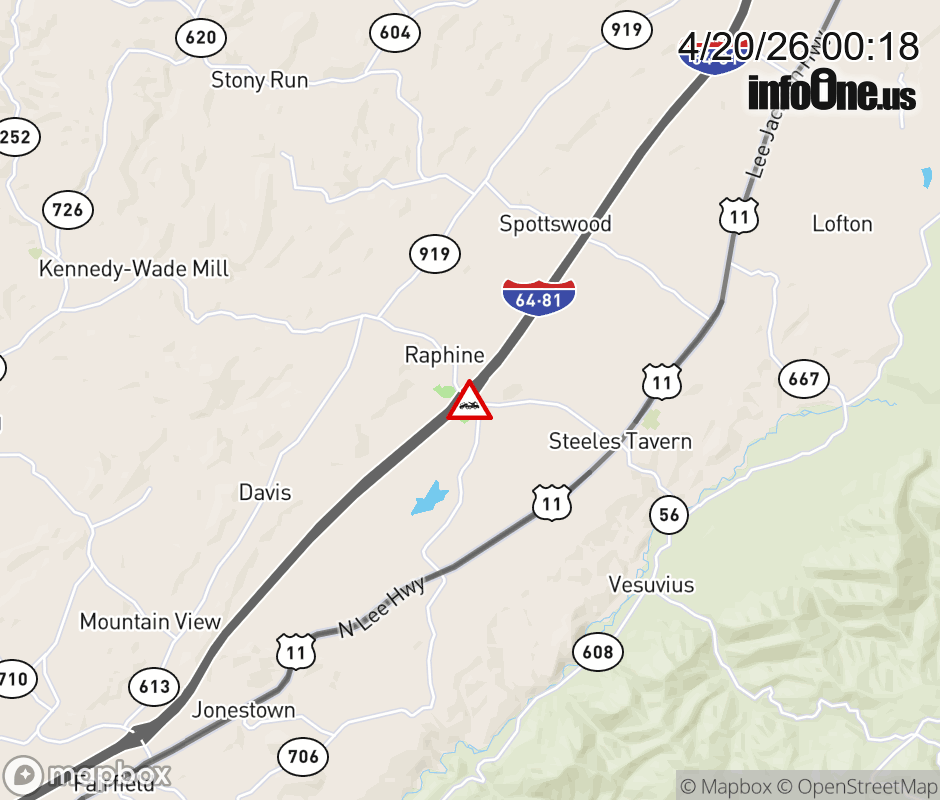 On Rt. 606 East in the County of Rockbridge, in the vicinity of the ramp from and to I-81N, motorists can expect delays due to a disabled tractor trailer. Updated: Mon 4/20/26 12:18 AM EDT ![]() Updated: Mon 4/20/26 12:18 AM EDT |