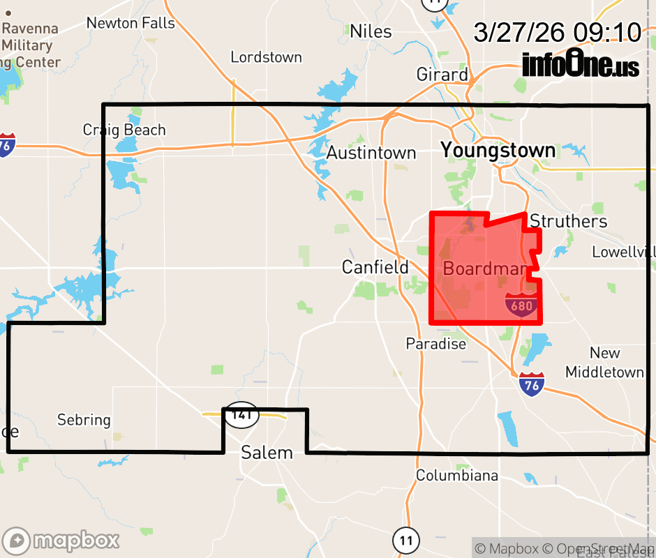 Canceled 3/27/26 3:40 PM Mahoning County has 1 power outage affecting 2 customers. Ohio Edison 2 without power Goshen Township: Customers affected: 19 (1%) Estimated repair: Fri 5:30 PM Updated: Fri 3/27/26 3:10 PM EDT ![]() Updated: Fri 3/27/26 9:10 AM EDT |