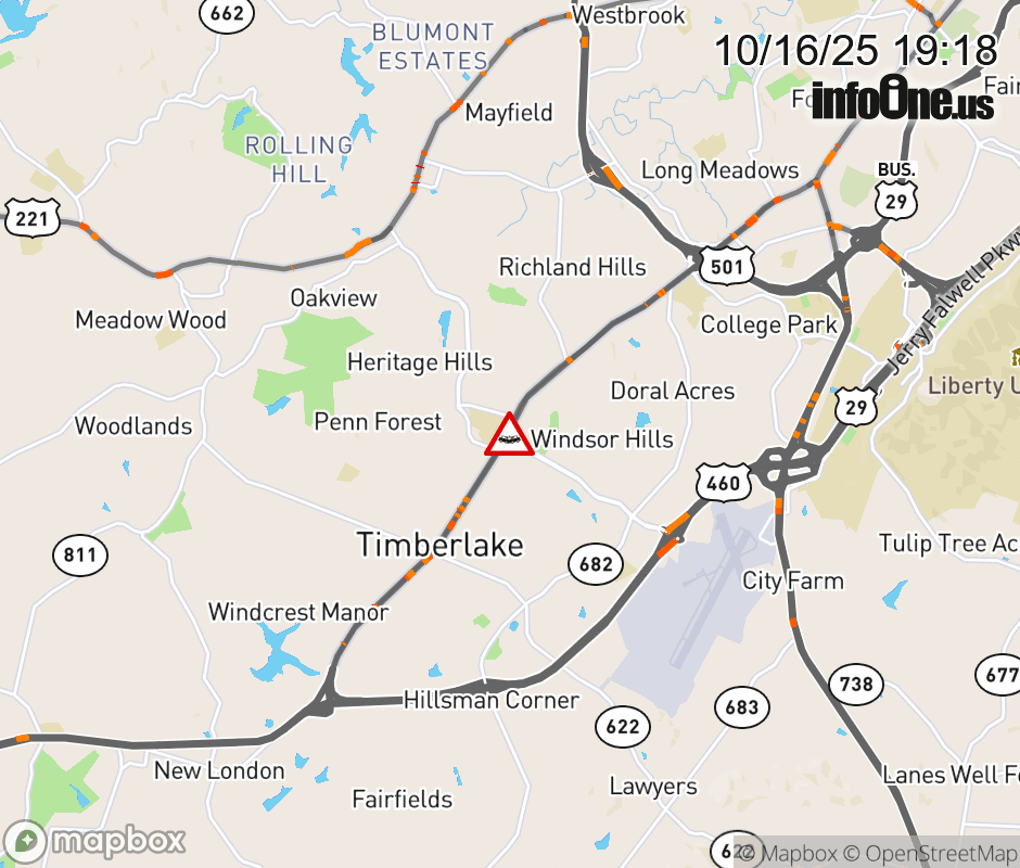 On Rt. 739 in the County of Campbell, in the vicinity of Timberlake Rd; BUS US-460E, BUS US-460E (11 Lynchburg/Amherst/Campbell), motorists can expect delays due to a multi-vehicle crash. All east lanes are closed. All west lanes are closed. ![]() |
