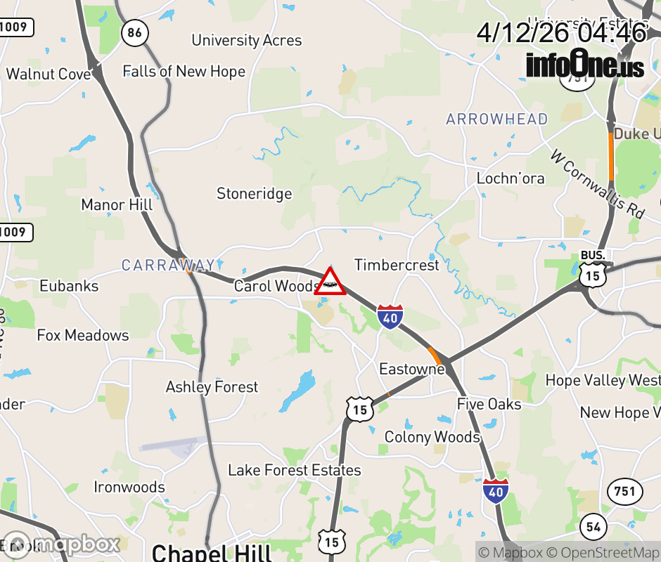 The right lane is closed 2 miles from Exit 266 (NC 86). Updated: Sun 4/12/26 4:46 AM EDT ![]() Updated: Sun 4/12/26 4:46 AM EDT |