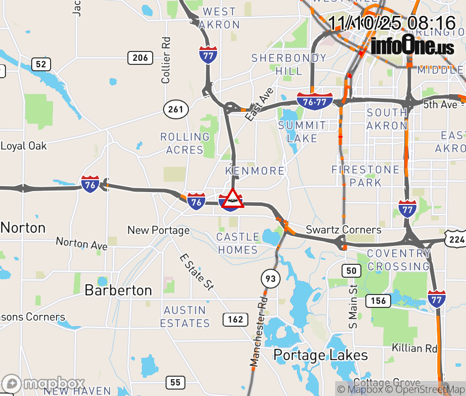 The left lane is blocked on Ramp I-277/US-224 West to I-76 East, due to a crash. ![]() |