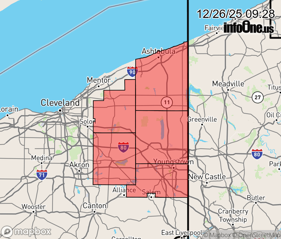 Canceled 12/26/25 10:50 AM Winter Weather Advisory issued December 26 at 9:27AM EST until December 26 at 3:00PM EST by NWS Cleveland OH * WHAT... Freezing rain expected. Total ice accumulations from a light glaze up to one tenth of an inch. * WHERE... Ashtabula Inland, Geauga, Mahoning, Portage, and Trumbull Counties. * WHEN... Until 3 PM EST this afternoon. * IMPACTS... Roads, and especially bridges and overpasses, will likely become slick and hazardous. Difficult travel conditions are possible. ![]() |
