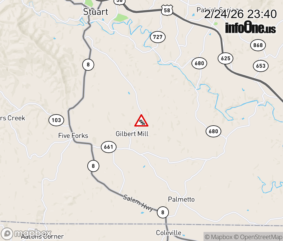 On Rt. 631 in the County of Patrick, in the vicinity of Hazelwood Dr; Rt. 651E/W (Patrick County), motorists can expect delays due to weather. All east lanes are closed. Updated: Tue 2/24/26 11:40 PM EST ![]() Updated: Tue 2/24/26 11:40 PM EST |