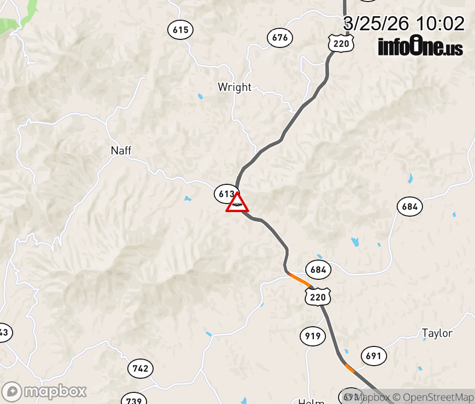 On US-220 North in the County of Franklin, in the vicinity of Naff Rd; Rt. 613E/W (Franklin County), motorists can expect delays due to a multi-vehicle crash. Lane closures exist. Updated: Wed 3/25/26 10:02 AM EDT ![]() Updated: Wed 3/25/26 10:02 AM EDT |