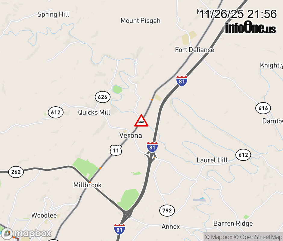 On Rt. 781 in the County of Augusta, in the vicinity of Lee Hwy; US-11N/S, motorists can expect delays due to a vehicle crash. All north lanes are closed. All south lanes are closed. ![]() |